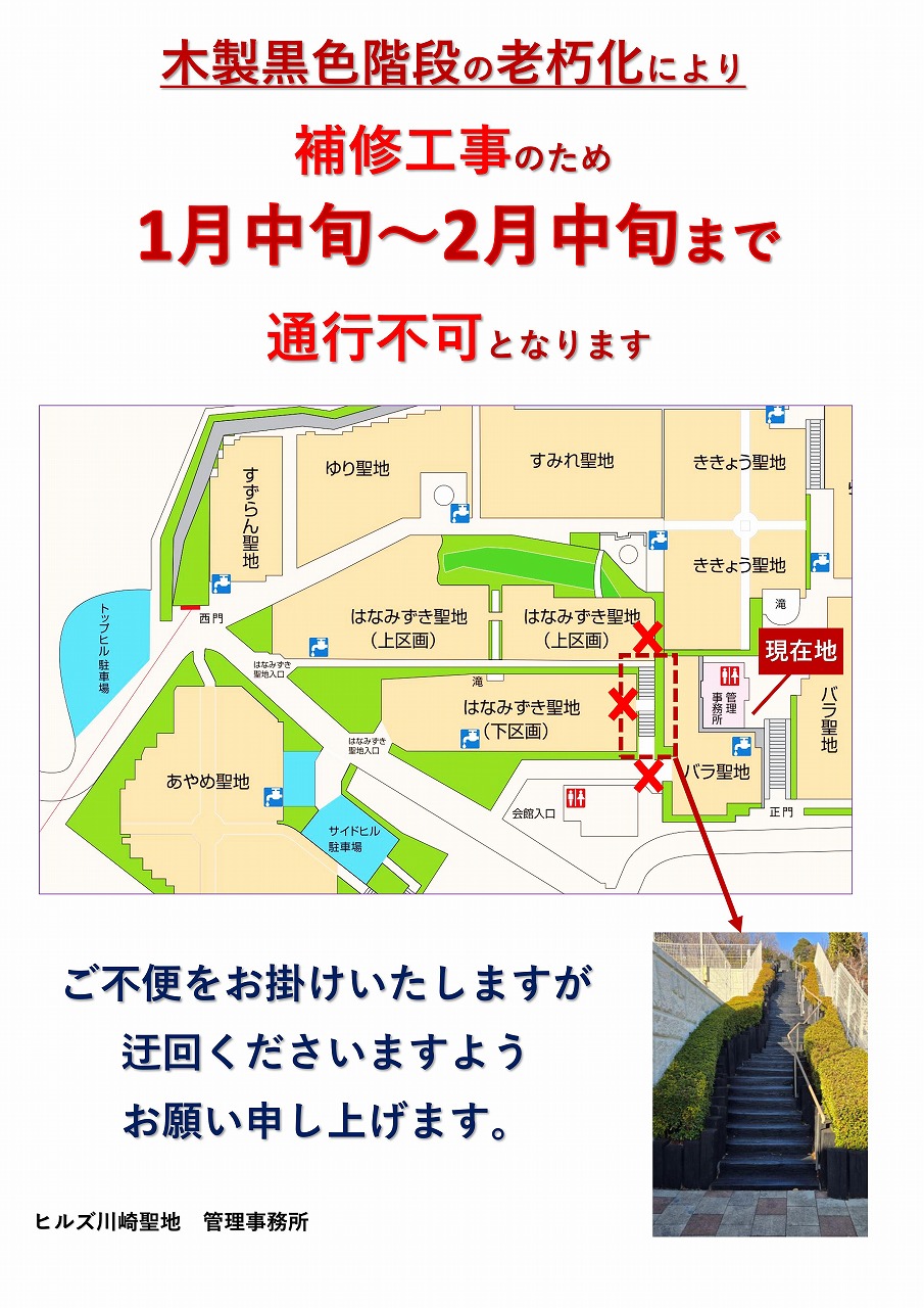 黒色木製階段補修工事のお知らせ (ヒルズ川崎聖地)